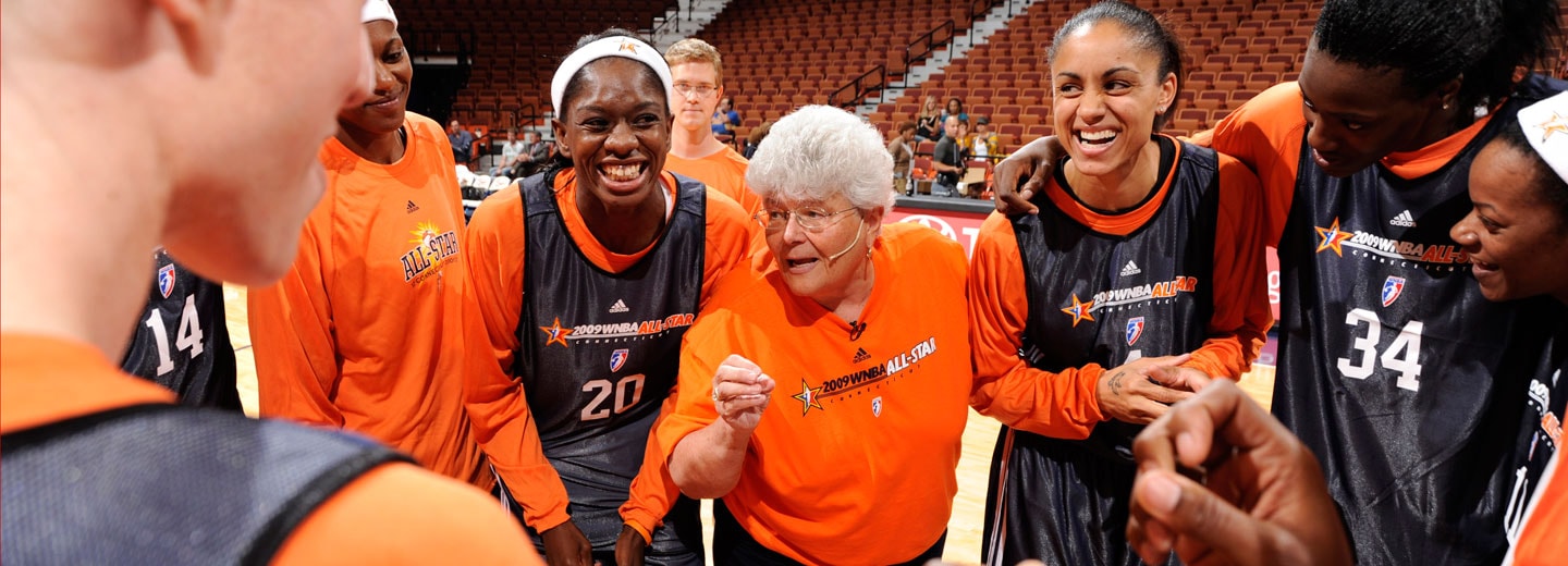 With her Tennessen twang, Lin Dunn worked the crowd while egging on her Eastern Conference team during All-Star practice today. The team opened with some rebound-into-fast break drills during which Dunn attempted to get Sylvia Fowles to dunk to no avail.