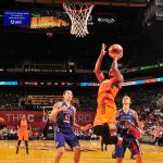 - Alyssa Thomas hangs in the air as she attempts a layup while surrounded by numerous Mercury defenders.