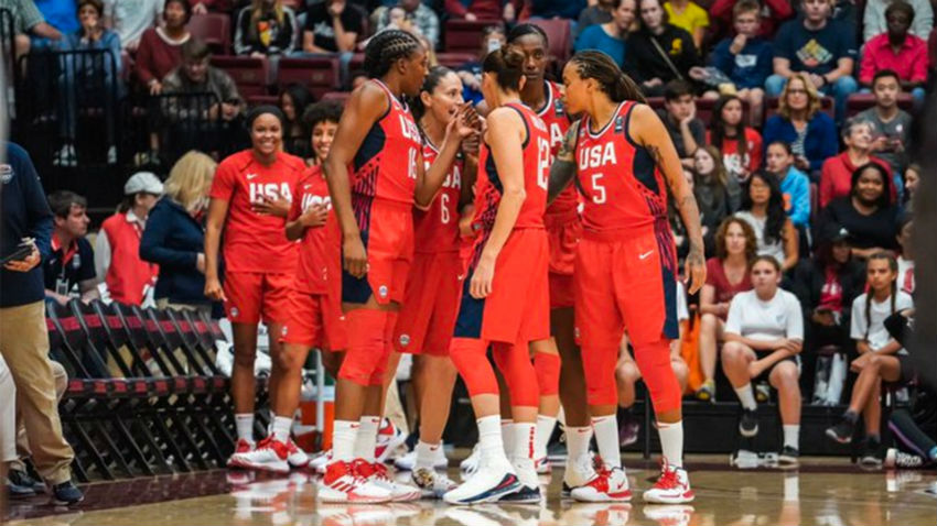 - Kelsey Plum (5), Jewell Loyd (4) and Morgan Tuck talk things over in USA’s win vs China, 100-88.
