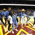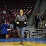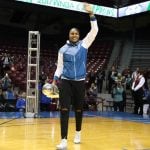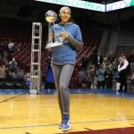 - Moore entering the arena with the WNBA Championship trophy.