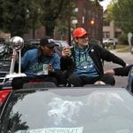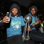 - Augustus and Brunson take a ride with the trophy.