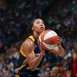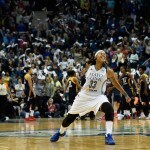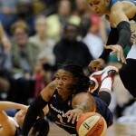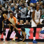 - Minnesota’s Seimone Augustus scampers down the court after a big shot in Game 2.