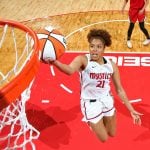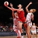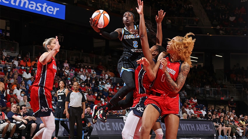 - WASHINGTON, DC – MAY 10: Dearica Hamby #5 of the Las Vegas Aces drives to the basket during the game against the Washington Mystics on May 10, 2022 at Capital One Arena in Washington, DC.