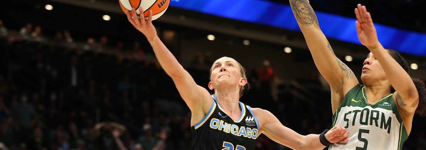 - SEATTLE, WA – MAY 18: Courtney Vandersloot #22 of the Chicago Sky drives to the basket during the game against the Seattle Storm on May 18, 2022 at Climate Pledge Arena on May 18, 2022 in Seattle, Washington.