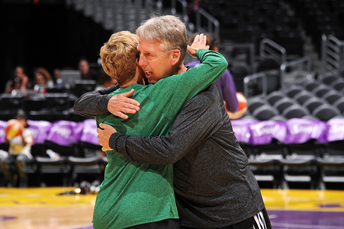 - Sparks head coach Brian Angler embraces a member of the Lynx staff prior to a June 16 game.