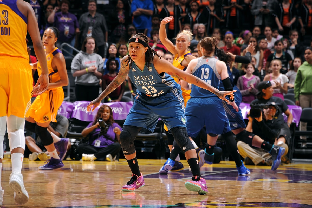 - Lynx guard Seimone Augustus locks down on defense.