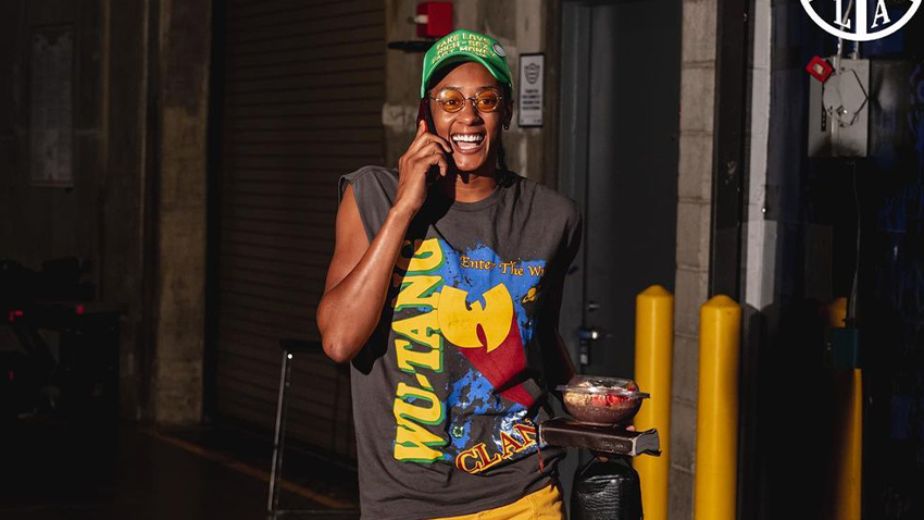 The most consistent element of Plum’s style is probably the tight topknot bun that keeps distractions away when she’s killing it on the court. She also rocks really dark eyebrows that scrunch up when Plum plots out her next moves in games. Since Plum builds her bold sense of style through a simple formula of curated pieces, she doesn’t rely on too many accessories. She’ll occasionally wear thin gold necklaces or hoop earrings and a pair of Fendi sunglasses. While some players have manicured nails or makeup, Plum is a true Southern California girl for keeping her look natural.