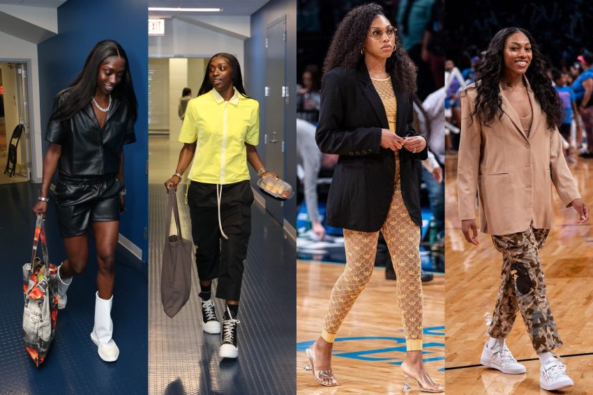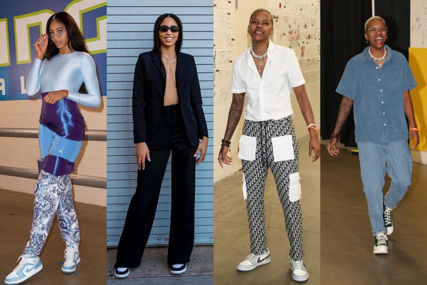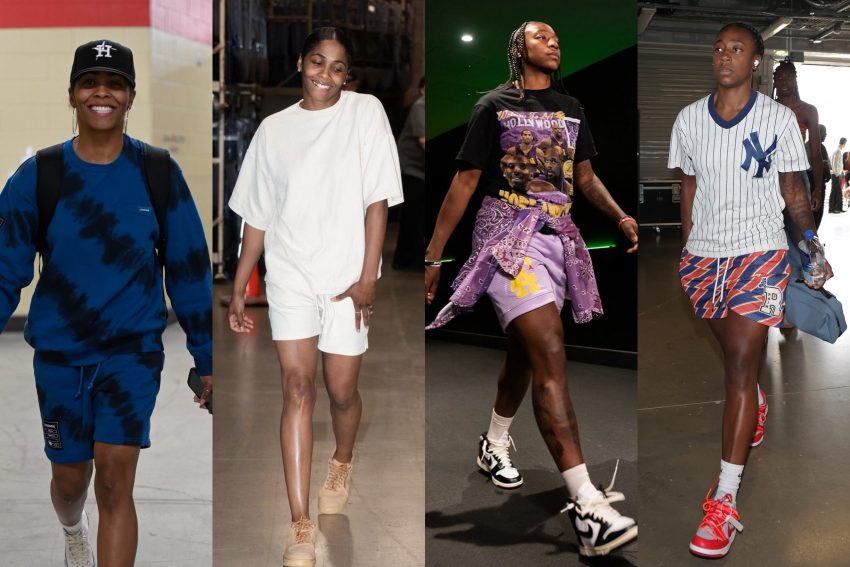 Her pre-game outfits feature loose, fluid materials and oversized pieces for added drama, capturing Diggins-Smith’s calm composure. She frequently wears custom silk or leather pieces from Anigwe’s brand KA Originals that are perfectly cropped to suit Diggins-Smith’s height. Wide-leg pants have also been heavily worn by Diggins-Smith this season, but she tends to gravitate towards muted colors and interesting textures. Unlike Plum, who tends to pair her wide-leg pants with cropped tops, Diggins-Smith will double-up with loose and long shirts for a full free-flow effect.