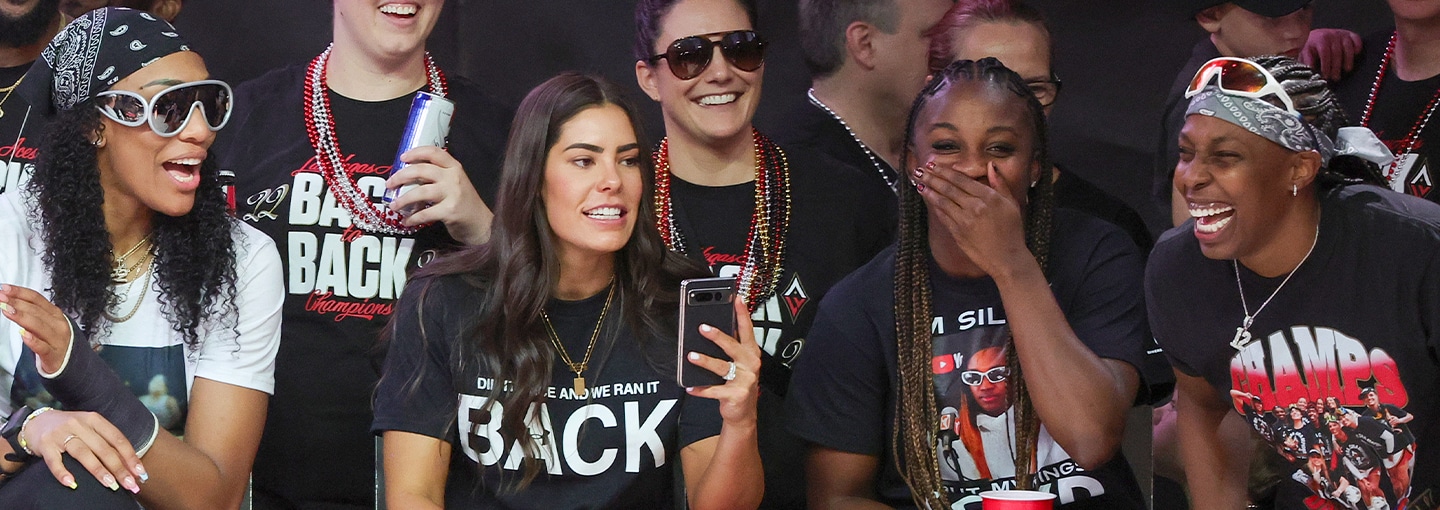 Drake’s “Back to Back” is blaring through the stage speakers at this point of the Las Vegas Aces championship parade, and Finals MVP A’ja Wilson is donning a shirt referencing the tune about the Aces’ consecutive championships. The crowd is lively, with a healthy mix of cheering, yelling, and karaoke-style vibing along to the song.