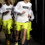 - Sue Bird and the Seattle Storm run out of tunnel prior to WNBA action wearing “Vote!” shirts.