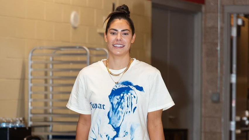 Bordonaro finds inspiration in a Devin Booker-like style for Jewell, which is “super clean, comfortable and relaxed, with a subtle flex! That’s really her.” With pinstripe pants, NV Neo Waveson shades from NOUVINTAGE, and a silk shirt, she explains that they went with a “mafia-style.” Although the final look was simple, she sent Loyd a variety of accessories like a matching Dior bucket hat. Overall, Loyd is happy with their collaboration, which allows her to focus on other parts of the game: “It’s been great, Sydney styles really well, so it makes it easier for us to pick outfits.”