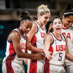 - Jewell Loyd, Elena Delle Donne, Kelsey Plum and A’ja Wilson celebrate after USA defeats Senegal.