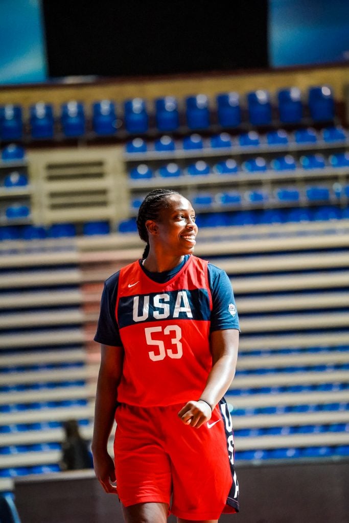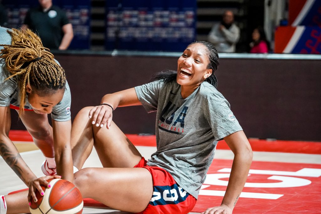 - A’ja Wilson of the Las Vegas Aces laughs ahead of practice in Belgrade, Serbia.