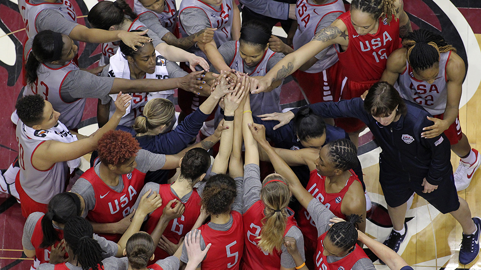 - The USA Women’s National Team huddles during game action.