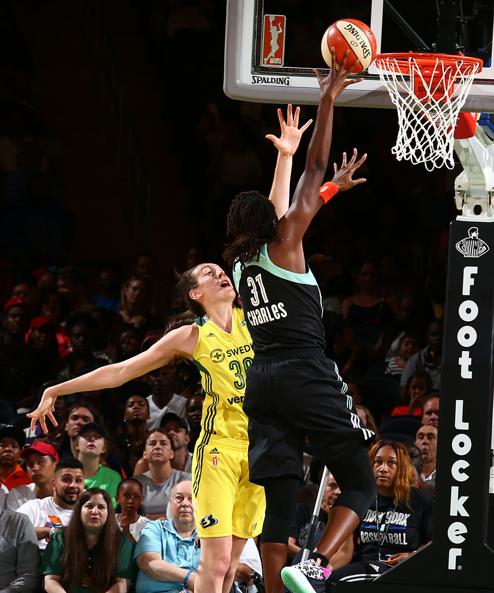 The pace of play has seemed to slow as these “bigs” play back to the basket and dispatch opponents with lethal combinations of drop steps, spin moves, and up-and-unders. For instance, Tina Charles and Sylvia Fowles (the No. 2 and No. 4 scorers in the league respectively) were recently named the WNBA’s Players of the Week. In reviewing all of their plays from the past week, a glaring similarity is readily apparent: baskets in the paint. Neither player is shooting 3’s or crossing up opponents; rather they set themselves on the block, receive the inbound pass and get to work. This blue collar, grind it out, post play has come to characterize the league. This season, the leading scorer on each of the top six teams in the league is over 6-2. It is not until the seventh ranked team, the Dallas Wings, that Skylar Diggins-Smith bucks the trend with her 18.5 points per game. Furthermore, eight of the top-10 rebounders in the league this season are also top-20 scorers as well. Four of those top six rebounders (Fowles, Griner, Stewart and Charles) are the top four scorers in the W.